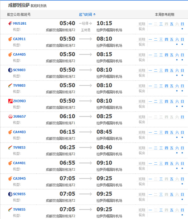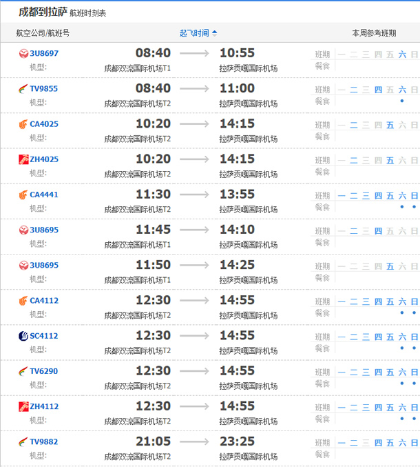 以上就是成都飛拉薩的航班時刻表,起飛時間,到達時間,及固定航班日期。