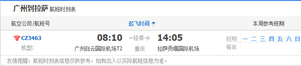 以上就是廣州飛拉薩的航班時刻表,起飛時間,到達時間,及固定航班日期。