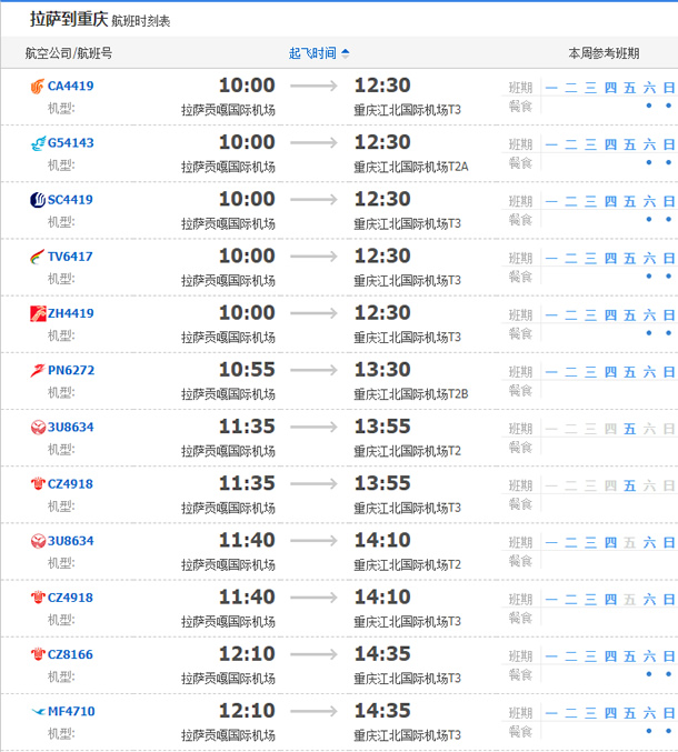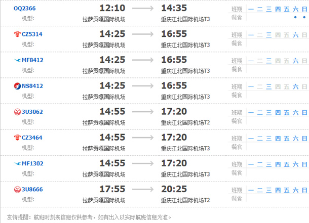 以上就是拉薩飛重慶的航班時(shí)刻表,起飛時(shí)間,到達(dá)時(shí)間,及固定航班日期。