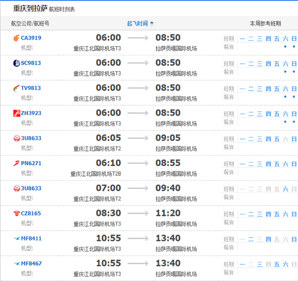 以上就是重慶飛拉薩的航班時刻表,起飛時間,到達時間,及固定航班日期。