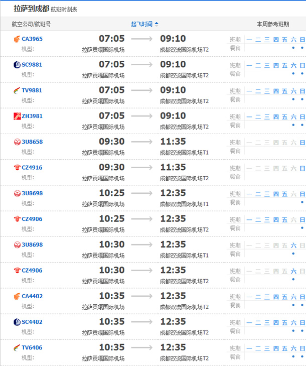 以上就是拉薩飛成都的航班時刻表,起飛時間,到達時間,及固定航班日期。