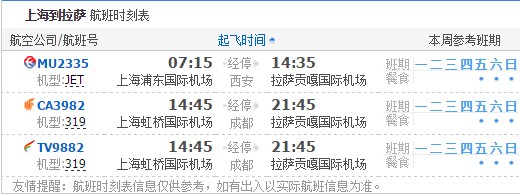以上就是上海飛拉薩的航班時刻表,起飛時間,到達時間,及固定航班日期。